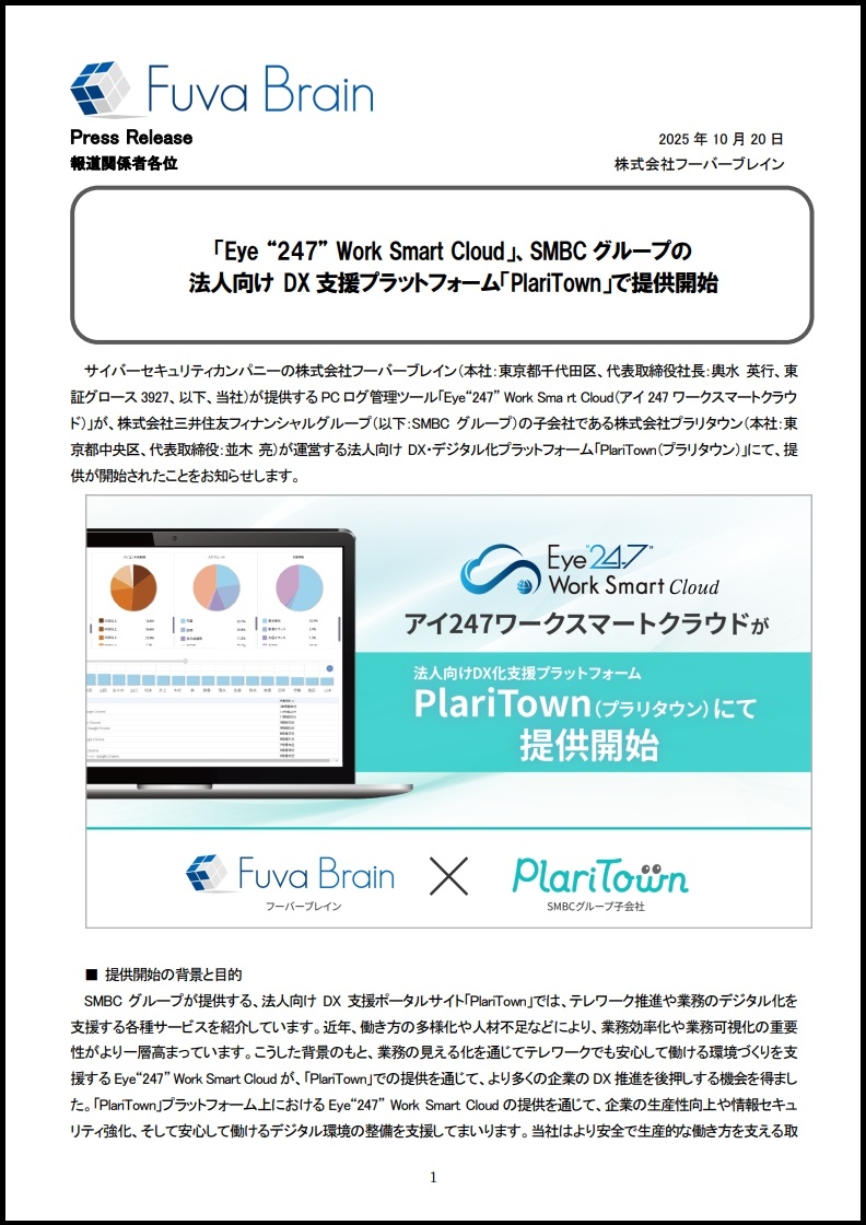 サイバーセキュリティカンパニーの株式会社フーバーブレイン(本社:東京都千代田区、代表取締役社長:輿水 英行、東証グロース3927)が提供するPCログ管理ツール「Eye“247” Work Smart Cloud(アイ247ワークスマートクラウド)」が、株式会社三井住友フィナンシャルグループの子会社である株式会社プラリタウン(本社:東京都中央区、代表取締役:並木亮)が運営する法人向けDX・デジタル化プラットフォーム「PlariTown(プラリタウン)」 にて、提供が開始されたことをお知らせします。