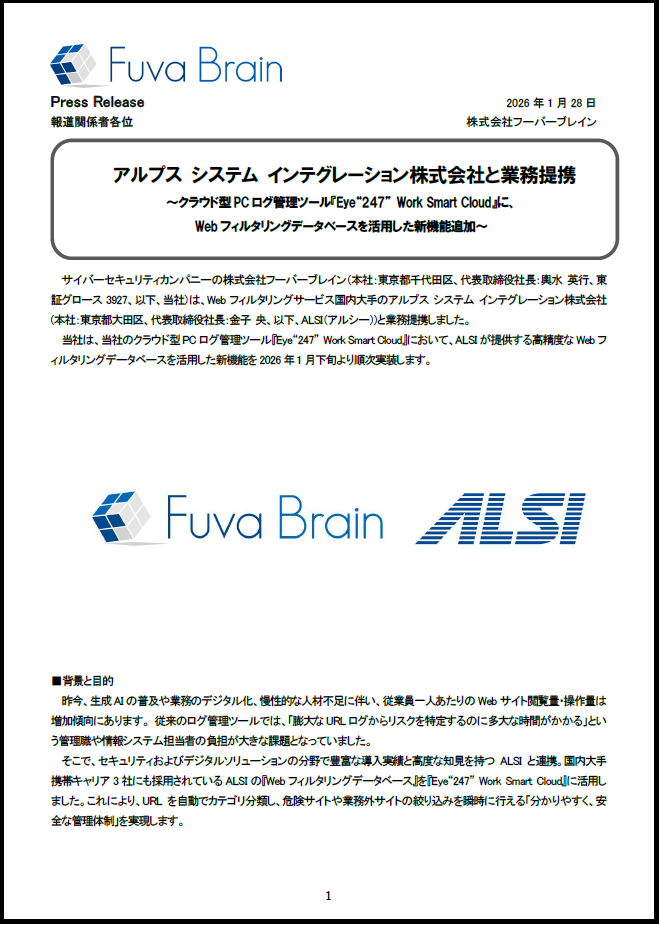 当社は、当社のクラウド型PCログ管理ツール『Eye“247” Work Smart Cloud』において、ALSIが提供する高精度なWebフィルタリングデータベースを活用した新機能を2026年1月下旬より順次実装します。