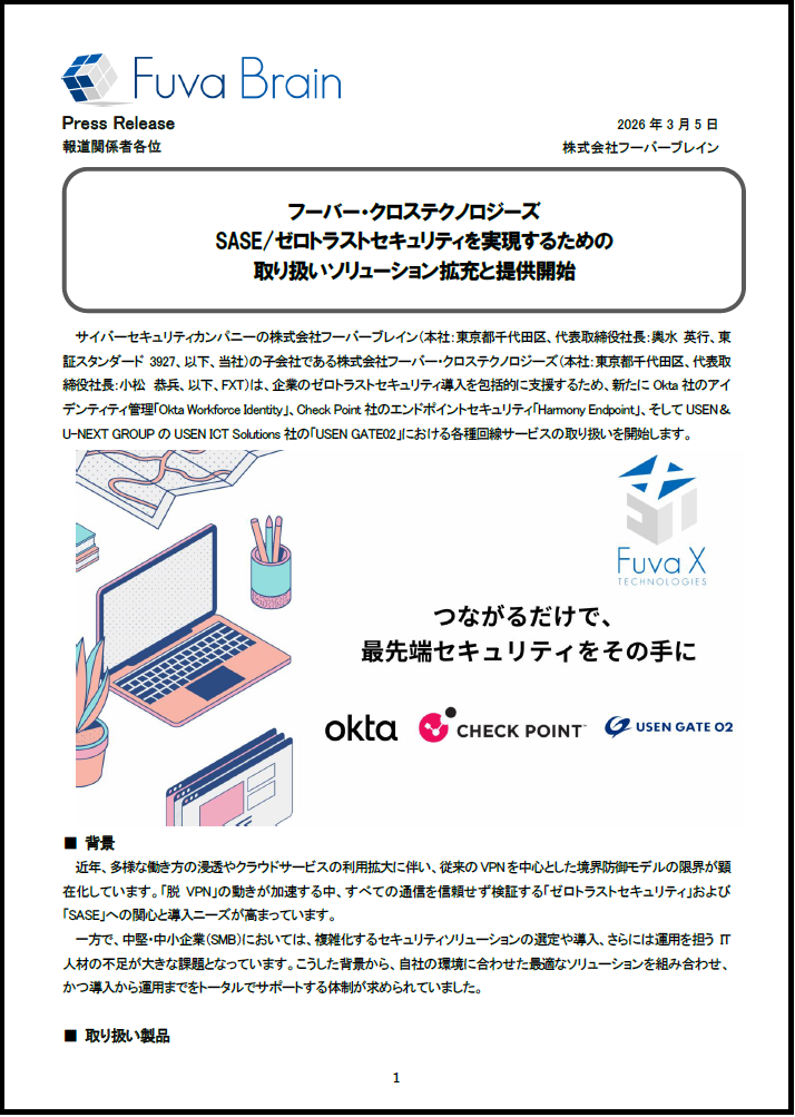 当社の子会社である株式会社フーバー・クロステクノロジーズ(本社:東京都千代田区、代表取締役社長:小松 恭兵、以下、FXT)は、企業のゼロトラストセキュリティ導入を包括的に支援するため、新たにOkta社のアイデンティティ管理「Okta Workforce Identity」、Check Point社のエンドポイントセキュリティ「Harmony Endpoint」、そしてUSEN&U-NEXT GROUPのUSEN ICT Solutions社の「USEN GATE02」における各種回線サービスの取り扱いを開始します。