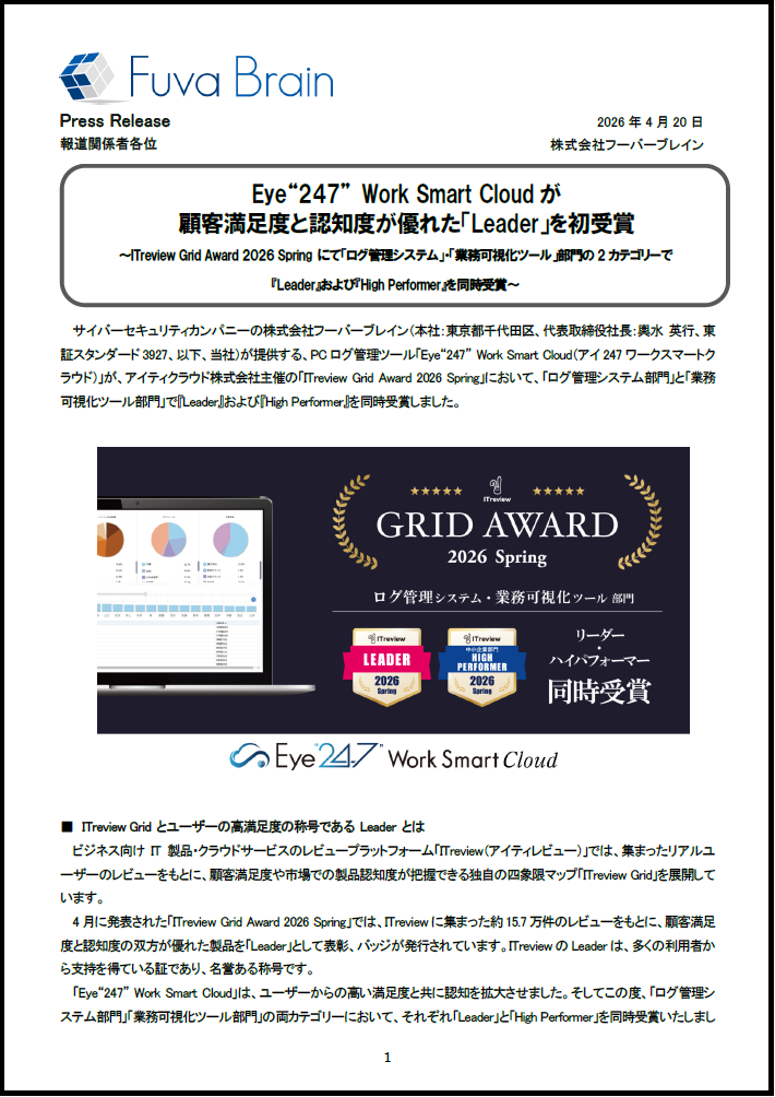 当社が提供する、PCログ管理ツール「Eye“247” Work Smart Cloud(アイ247ワークスマートクラウド)」が、アイティクラウド株式会社主催の「ITreview Grid Award 2026 Spring」において、「ログ管理システム部門」と「業務可視化ツール部門」で『Leader』および『High Performer』を同時受賞しました。