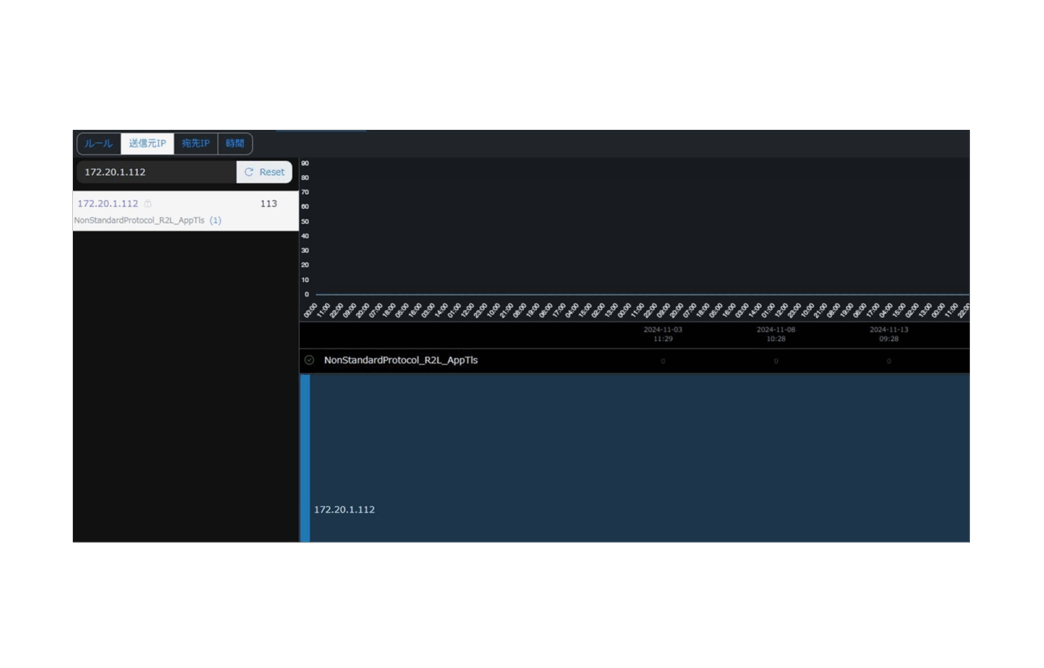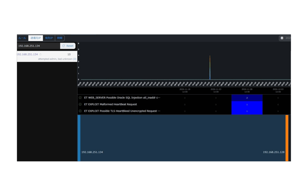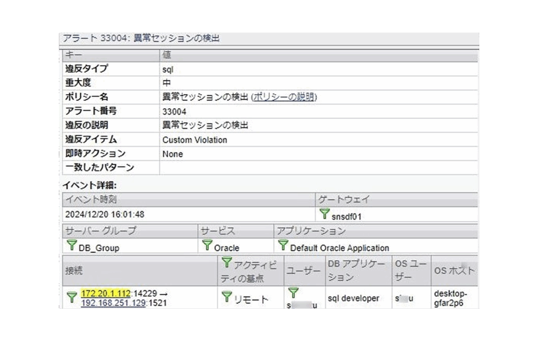 データベース(IPアドレス: 192.168.251.129)への異常セッション(IPアドレス: 172.20.1.112)を検出