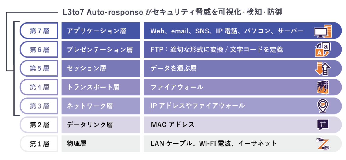 L3to7 Auto-response は、ネットワーク層~アプリケーション層を横断するセキュリティ脅威に対し、可視化・検知・防御を一気通貫で実現するセキュリティ連携ソリューションです。